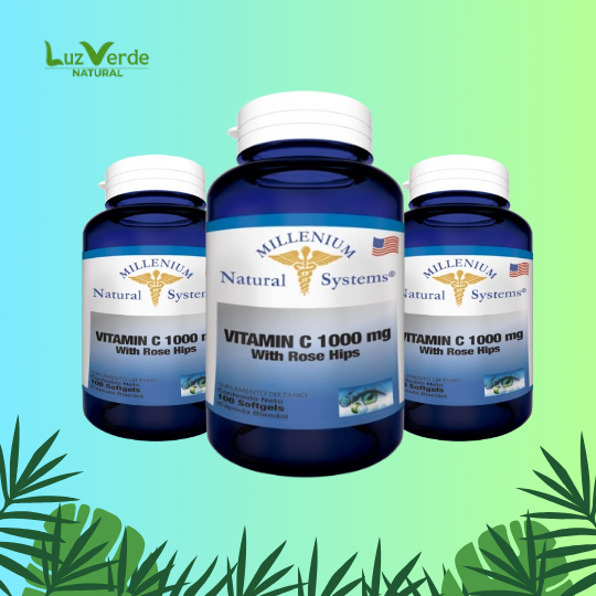 100 capsulas cada cápsula blanda contiene 1000 mg de Vitamina C y 20 mg de Rose Hips